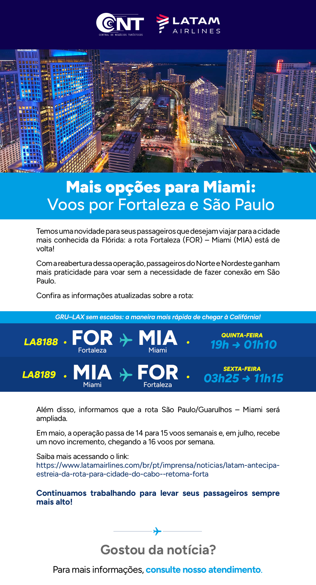Mais opções para Miami:Voos por Fortaleza e São Paulo