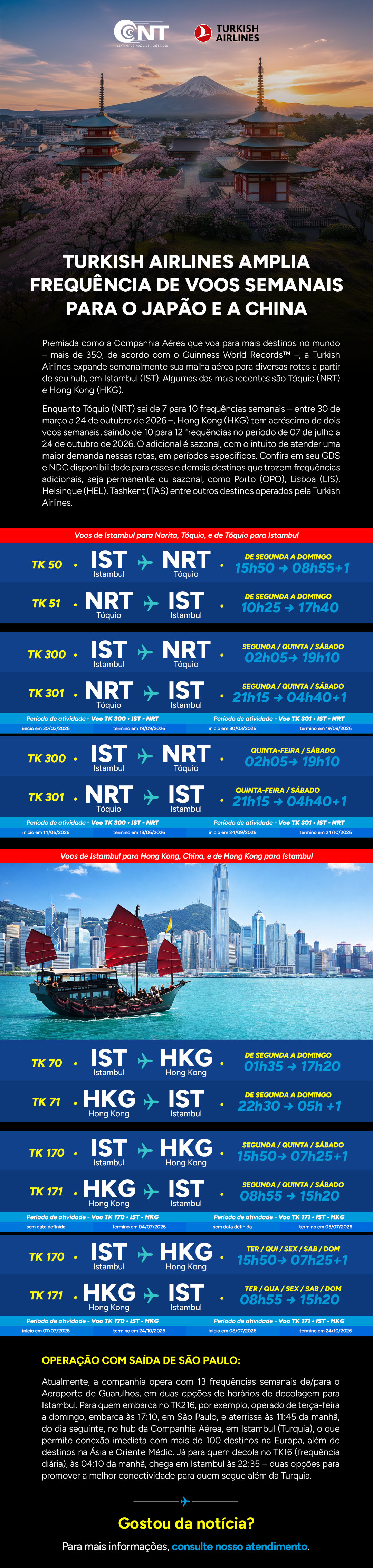 Turkish Airlines AMPLIA oferta de VOOS para o JAPÃO e CHINA (HKG)