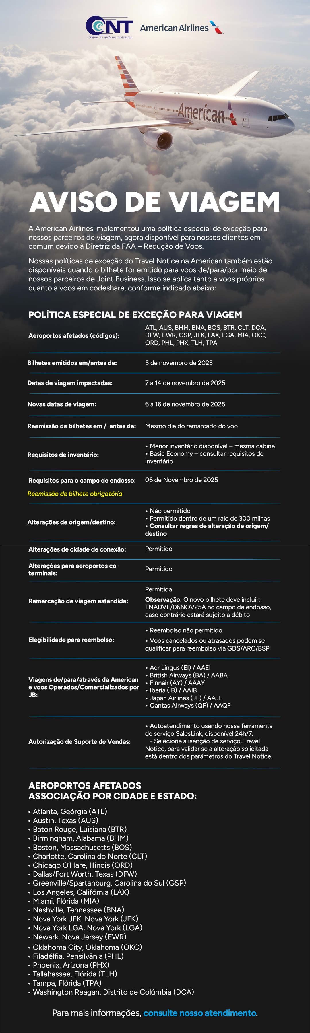 Aviso de Viagem American – Diretriz da FAA – Redução de Voos