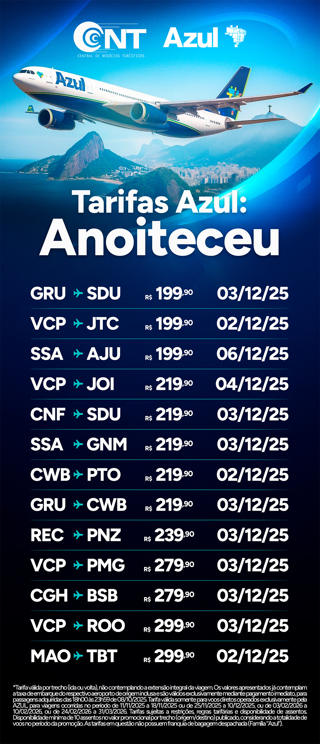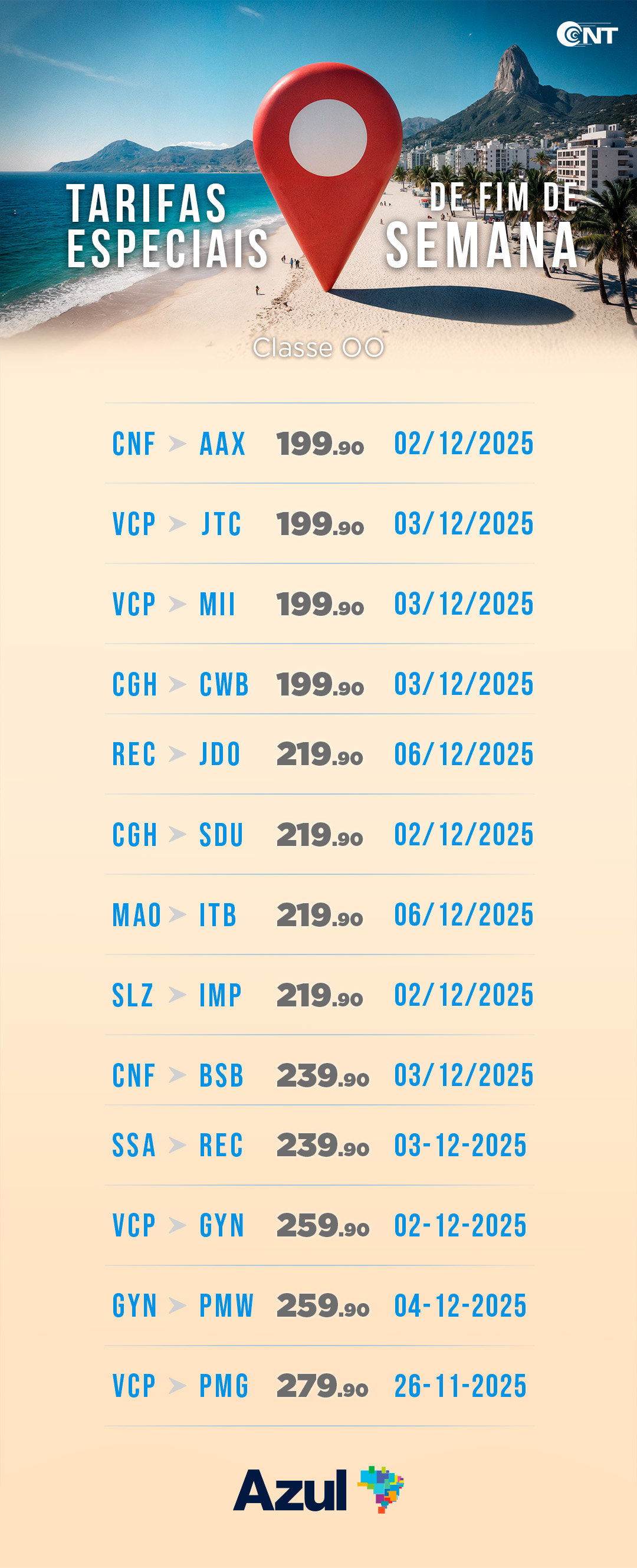 *Tarifa válida por trecho (ida ou volta), não contemplando a extensão integral da viagem. Os valores apresentados já contemplam a taxa de embarque do respectivo…