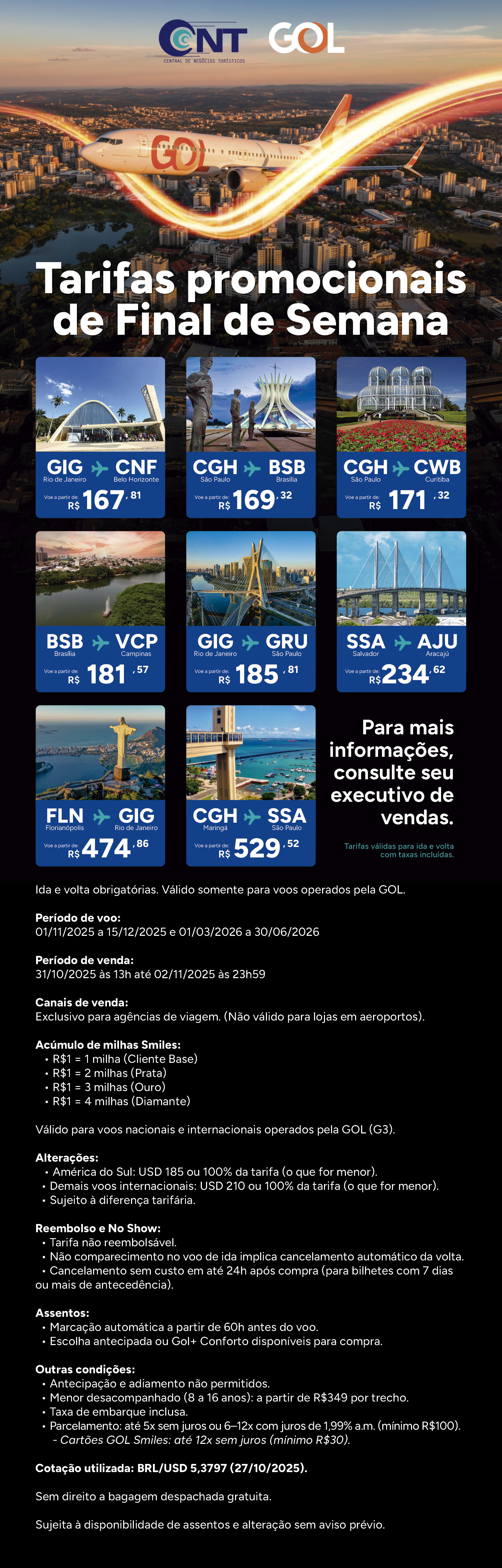 Atenção: Parcelamento é válido somente para cartões de crédito de pessoa física emitidos no Brasil. Reconfirme com seu passageiro se o cartão utilizado para transação, se enquadra na política determinada pela Cia Aérea.